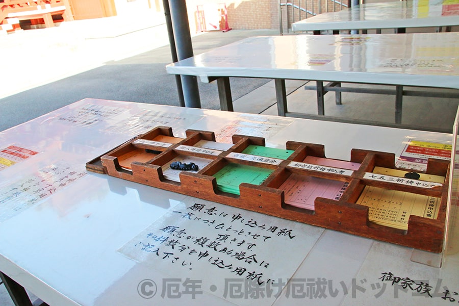 ※稲毛浅間神社 御祈祷申込用紙と記入所の様子