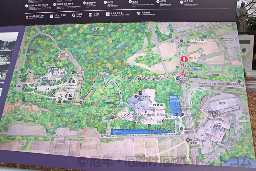 宮城縣護國神社 仙台城(青葉城)本丸城址の周辺図案内図の様子