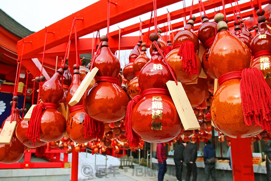 ひょうたん本体には「厄難消除」の文字も。↑のように数多くのひょうたんが掛けられており、これだけで同神社に厄除けのご利益を求めて参拝する人、実際に祈祷をお願いする人が多いことがうかがえます。