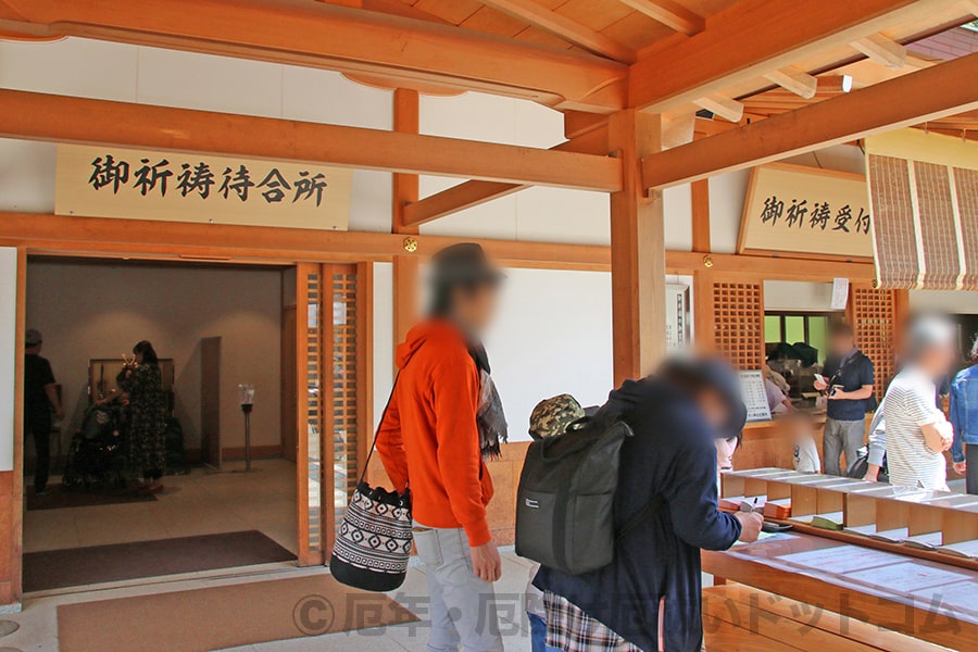※大宮氷川神社 祈祷殿手前の記入所と御祈祷受付窓口・ご祈祷待合所入口の様子|画像提供:厄年・厄除け厄祓いドットコム