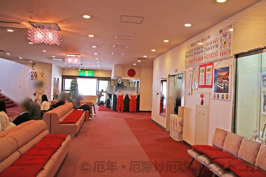 ※千葉神社 参集殿内御祈祷受付(写真中央奥)と待合スペースの様子|画像提供:厄年・厄除け厄祓いドットコム