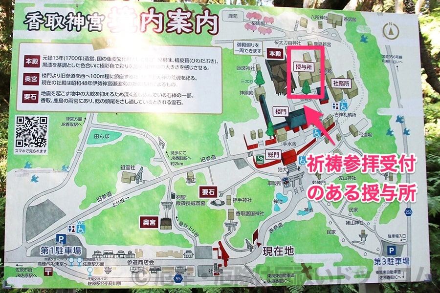 ※香取神社 境内案内図 祈祷参拝受付の場所の様子|画像提供:厄年・厄除け厄祓いドットコム