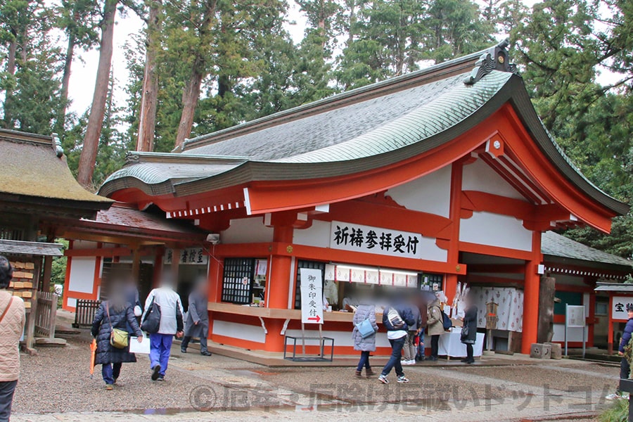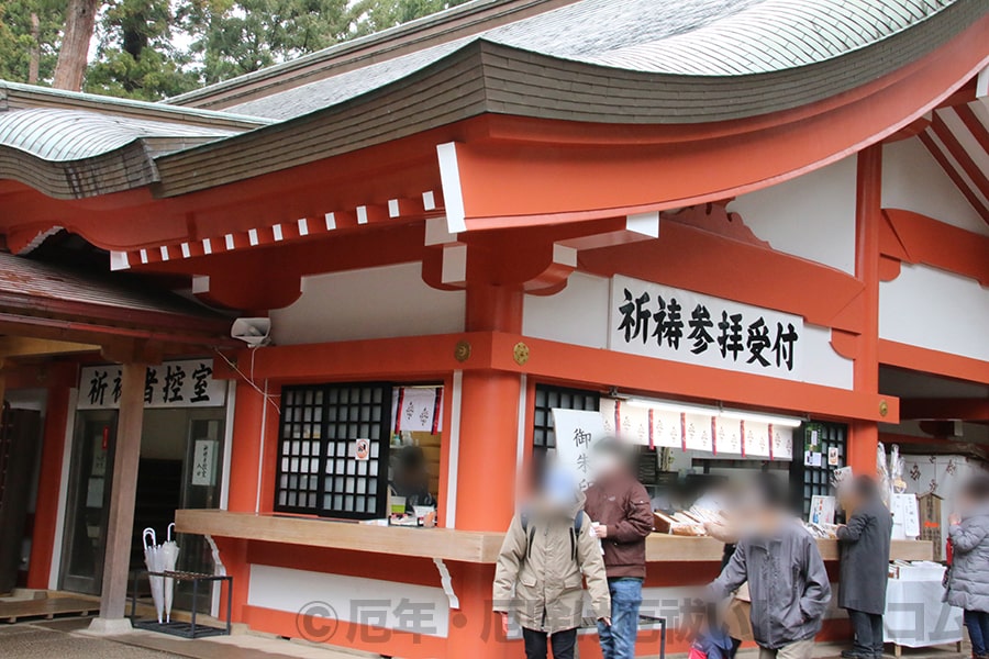 こちらの御祈祷受付の窓口で厄除け・厄払いの御祈祷を申し込むわけですが、正面の授与所窓口が祈祷参拝の受付窓口を兼ねている場合もあれば、側面の窓口が祈祷受付の窓口になる場合もあります。