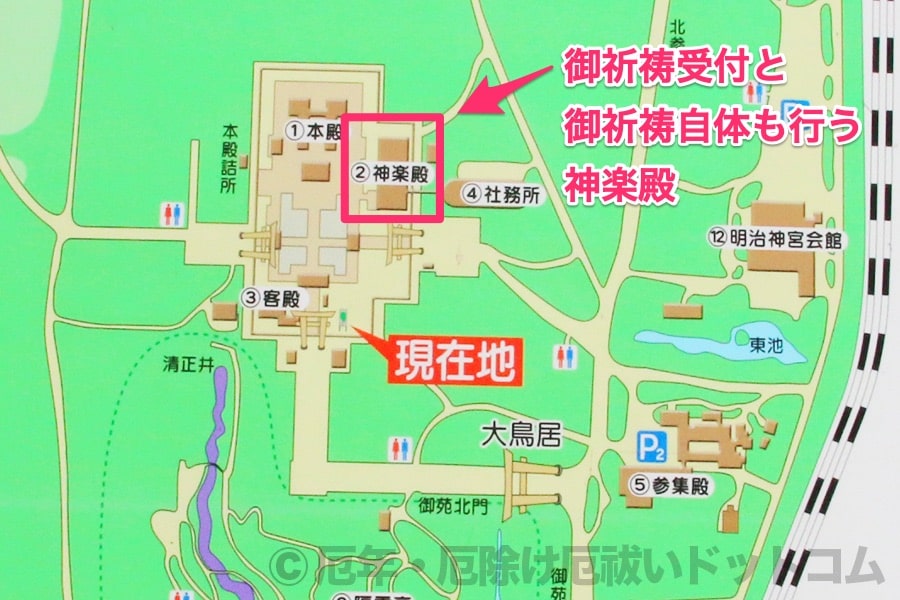 ※明治神宮 境内案内図の御祈祷受付のある神楽殿の場所の様子|画像提供:厄年・厄除け厄祓いドットコム
