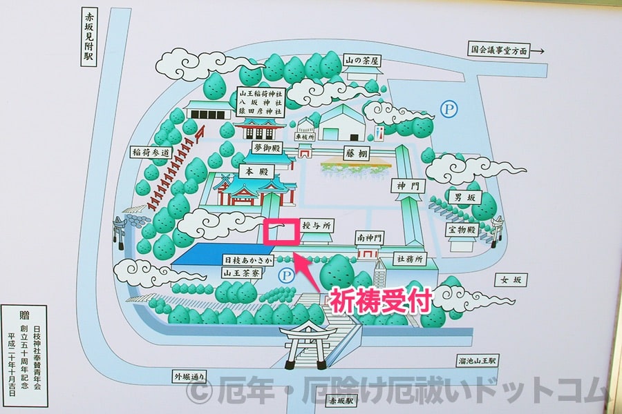 ※日枝神社 境内案内図の祈祷受付のある場所の様子|画像提供:厄年・厄除け厄祓いドットコム