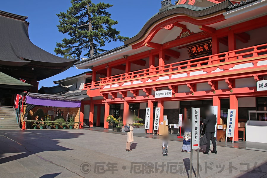 厄除けのお護摩が行われる不動堂の手前右手にある「宝輪閣」の中にお護摩受付があります。
