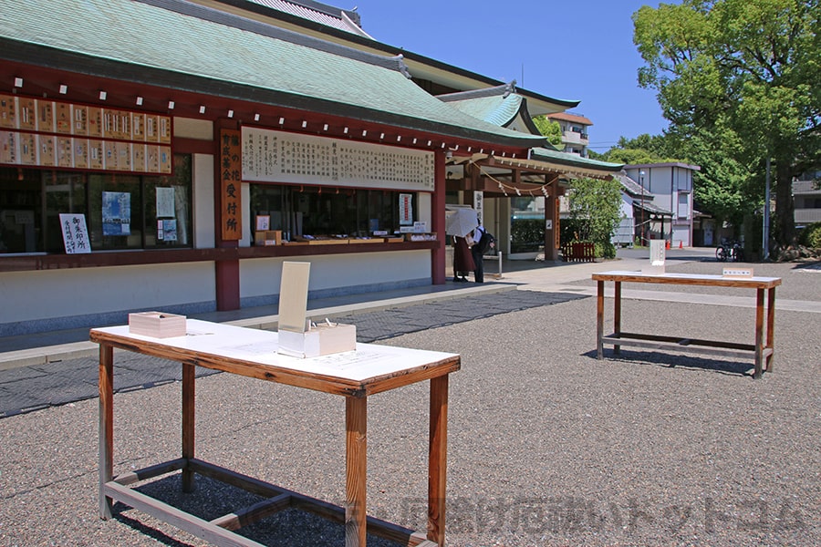 こちらの御祈祷受付の窓口で厄除け・厄払いの御祈祷を申し込むわけですが、↑写真のように社務所の手前に御祈祷の申込用紙が置かれた記入台があるので、そこで申込用紙に記入をしてから受付窓口で申し込みを行います。