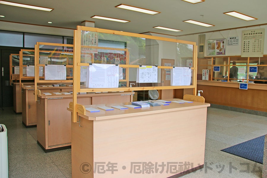 ※西新井大師 御祈願受付所の受付窓口(写真右奥)と申込用紙の記入台の様子|画像提供:厄年・厄除け厄祓いドットコム