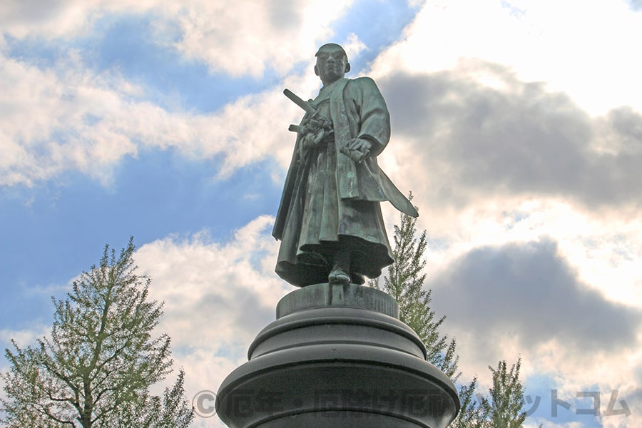境内入口の大鳥居をくぐり幅の広い参道をまっすぐ進んでいくと、正面に巨大な土台とその上に鎮座の大村益次郎銅像が見えてきます。