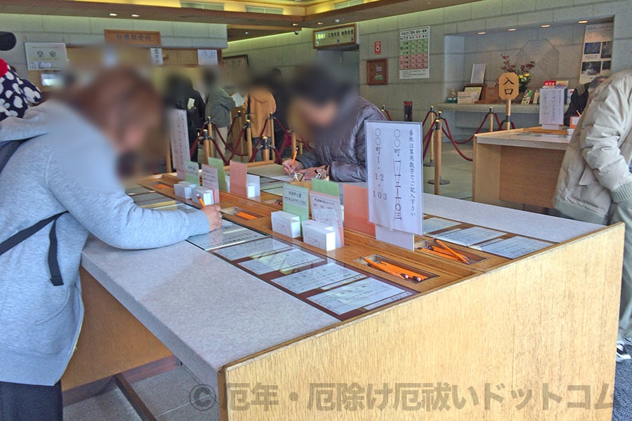 ※寒川神社 客殿内の申込用紙記入所と奥にある御祈願受付窓口の様子|画像提供:厄年・厄除け厄祓いドットコム