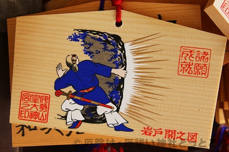 こちらの絵馬は、天の岩戸が開かれる際の天手力男命(アメノタヂカラオ)が開く様子が描かれています。力強く描かれており、その力強さで諸願成就となるのでしょう。