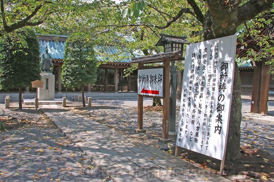 ※三嶋大社 境内に設置の御祈祷の御案内板と御祈祷受付への案内板の様子|画像提供:厄年・厄除け厄祓いドットコム