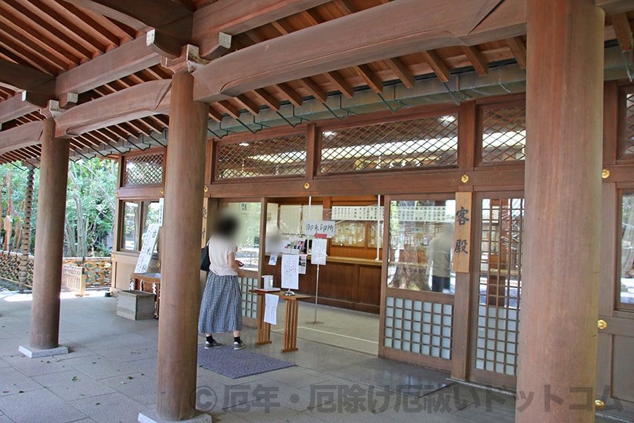 境内中央参道、神門手前左手にある「客殿」に祈祷受付所の受付窓口があります。