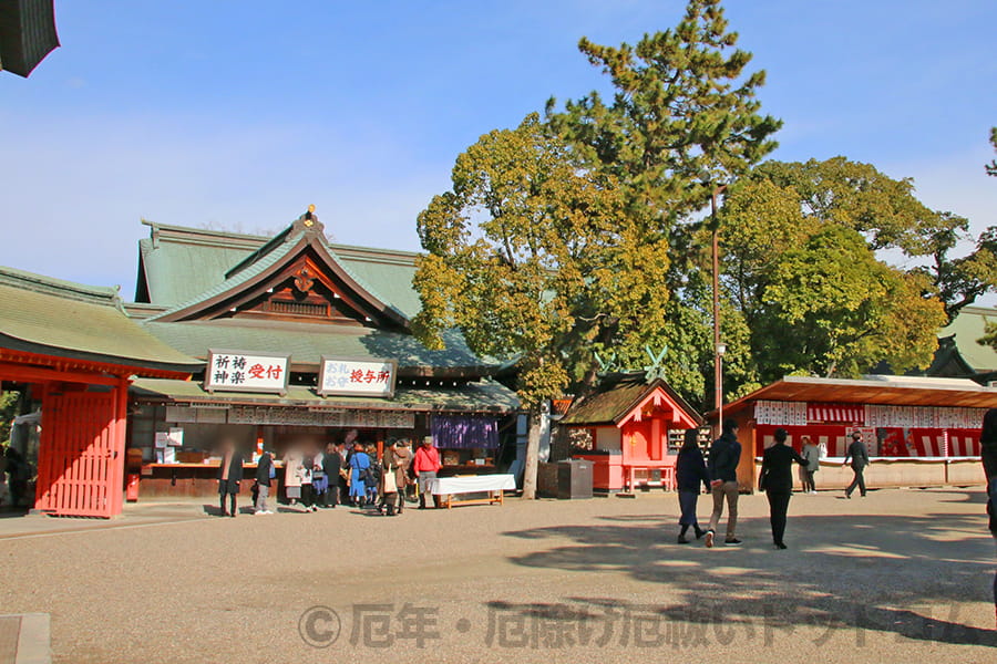 ↑上図の赤枠で囲まれたところ(赤枠・赤文字は当サイトにて加筆)のところに授与所などと並んで「祈祷神楽受付」があり、そこに御祈祷受付の受付窓口があるので、そこで厄除け・厄払いの御祈祷の申し込みを行います。