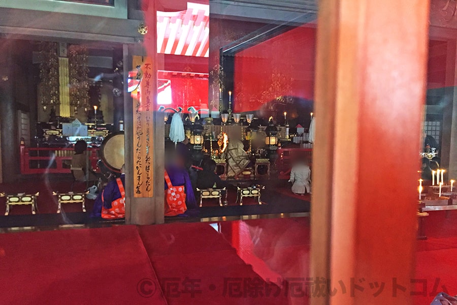 さていよいよ本堂内での御祈祷を受ける時間が来たら、本堂内の外陣(御祈祷を受けるスペース)にてお護摩を焚いての御祈祷が始まります。