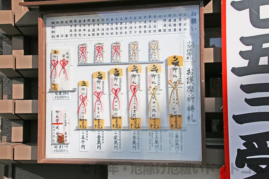 ※成田山大阪別院明王院 総受付に設置されているお護摩祈祷札の案内掲示の様子|画像提供:厄年・厄除け厄祓いドットコム