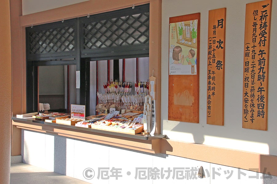 厄除けのお守りを含めた各種お守り、授与物などは同じ社務所の↑の窓口にて授与してもらうことができます。