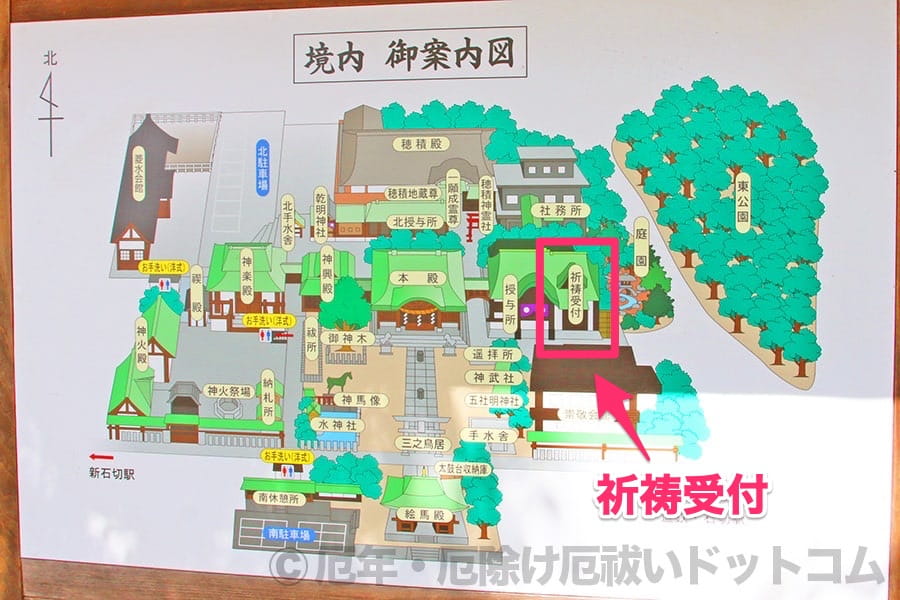 ↑上図の赤枠で囲まれたところ(赤枠・赤文字は当サイトにて加筆)のところに「祈祷受付(御祈祷受付所)」のお社があり、そのお社の中に御祈祷の受付窓口があるので、そこで厄除け・厄払いの御祈祷の申し込みを行います。