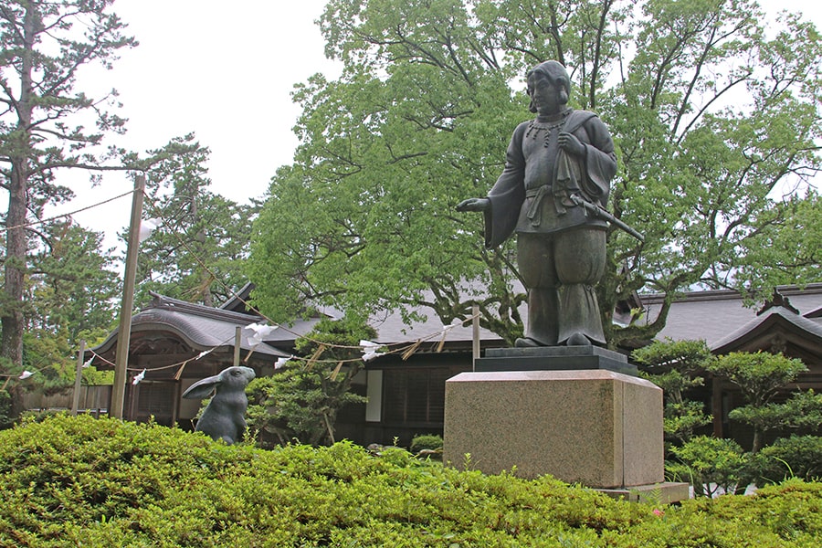 神話の「因幡の白うさぎ」のシーンを表現した大国主大神と白ウサギの御神像です。