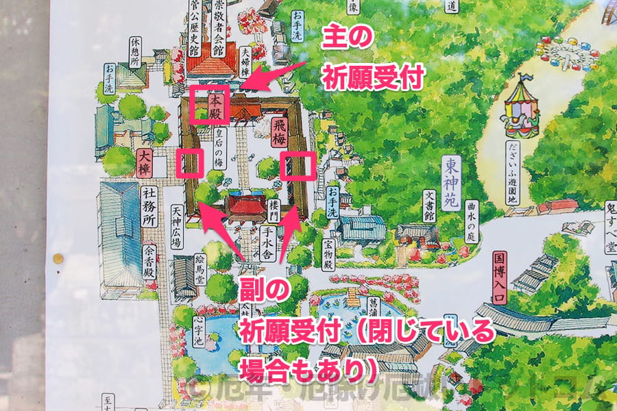 ※太宰府天満宮 境内案内図上での祈願受付の場所の様子|画像提供:厄年・厄除け厄祓いドットコム