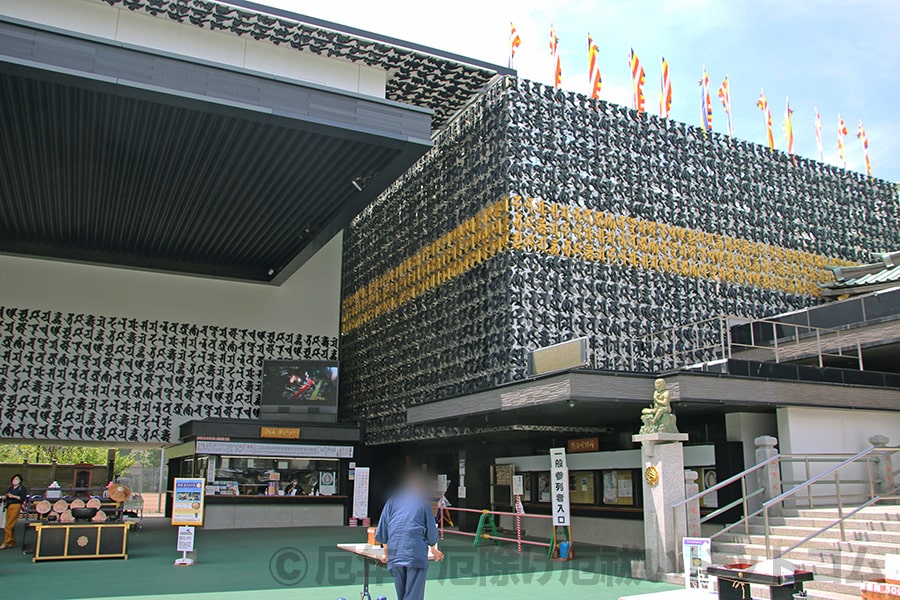 新本堂の外壁にはひとつひとつ梵字がかたどられたオブジェがびっしりと並べられ貼り付けられています。