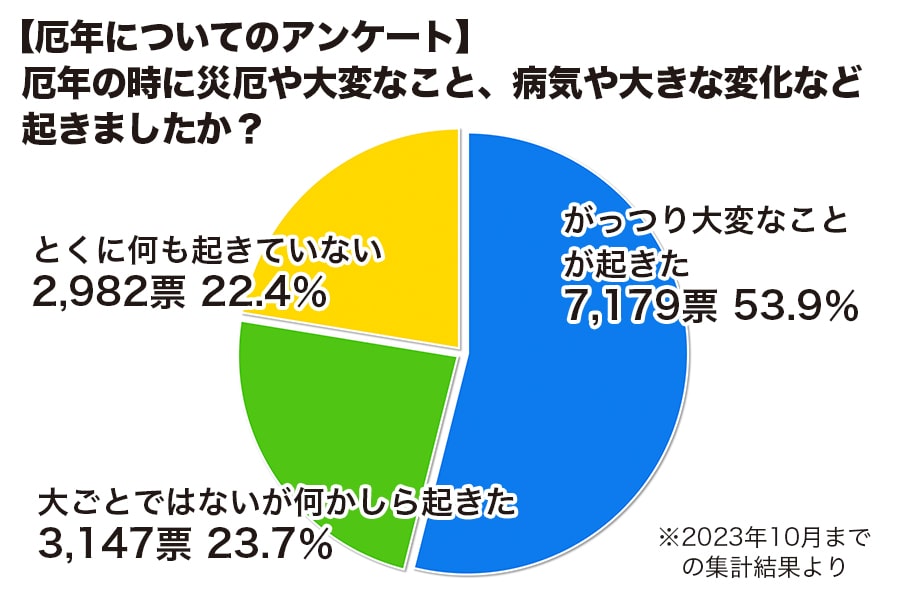 と答えており、76%以上にのぼる多くの人が厄年に何かしらの災厄や大変なことに遭ってしまっていることがわかります。