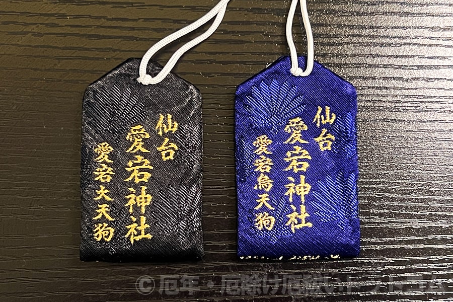 両お守りの裏も表と同じく、厄除守は黒字に、開運守は青字にともに、天狗の持つ羽団扇があしらわれており、ともに仙台愛宕神社の文字が金色糸で刺繍されています。