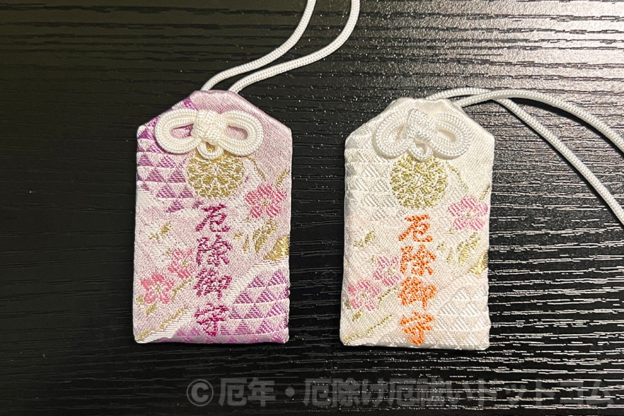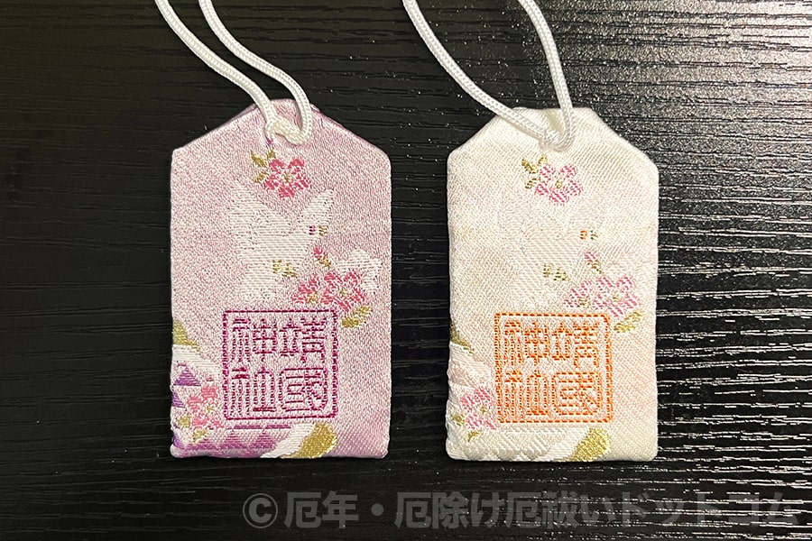 表側には、それぞれ紫地、白地に桜のデザインと三角鱗紋があしらわれており、中央には靖国神社の神紋たる「菊に桜」の紋が金色糸で刺繍され、その下に紫糸・橙糸で厄除御守と刺繍されたデザインになっています。