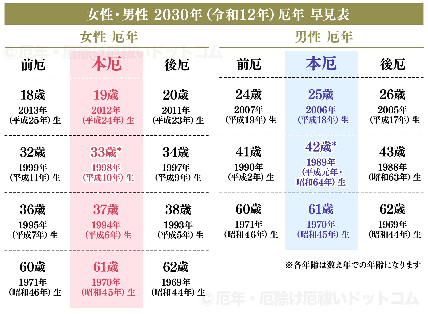 ※2030年(令和12年)厄年早見表(女性・男性一覧)|作成:厄年・厄除け厄祓いドットコム