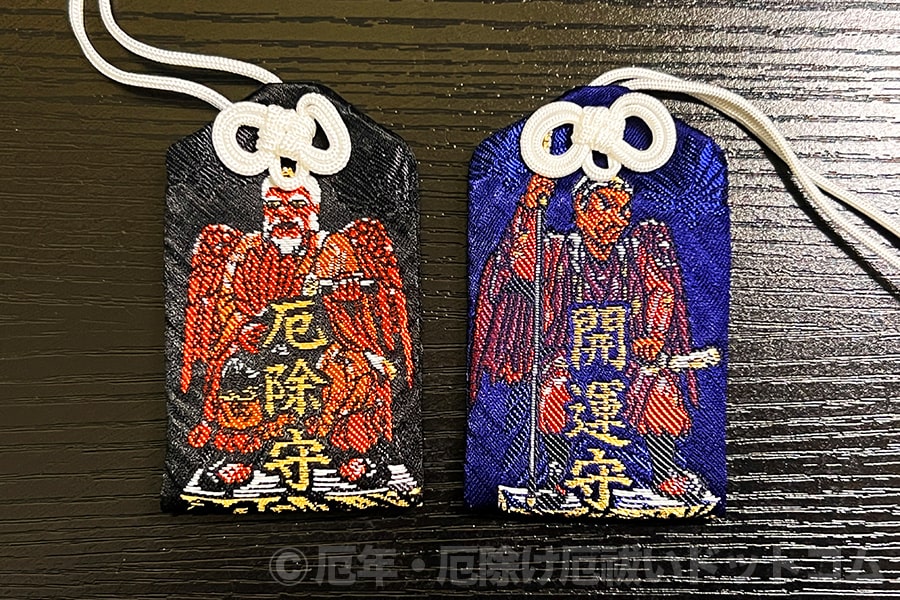 厄除守の方は黒字に大天狗様が描かれ(刺繍され)、厄を除けるお守りとして、そして開運守の方は青字に烏天狗様が描かれ、開運への導きのお守りとして御祈願された両お守りとなっています。